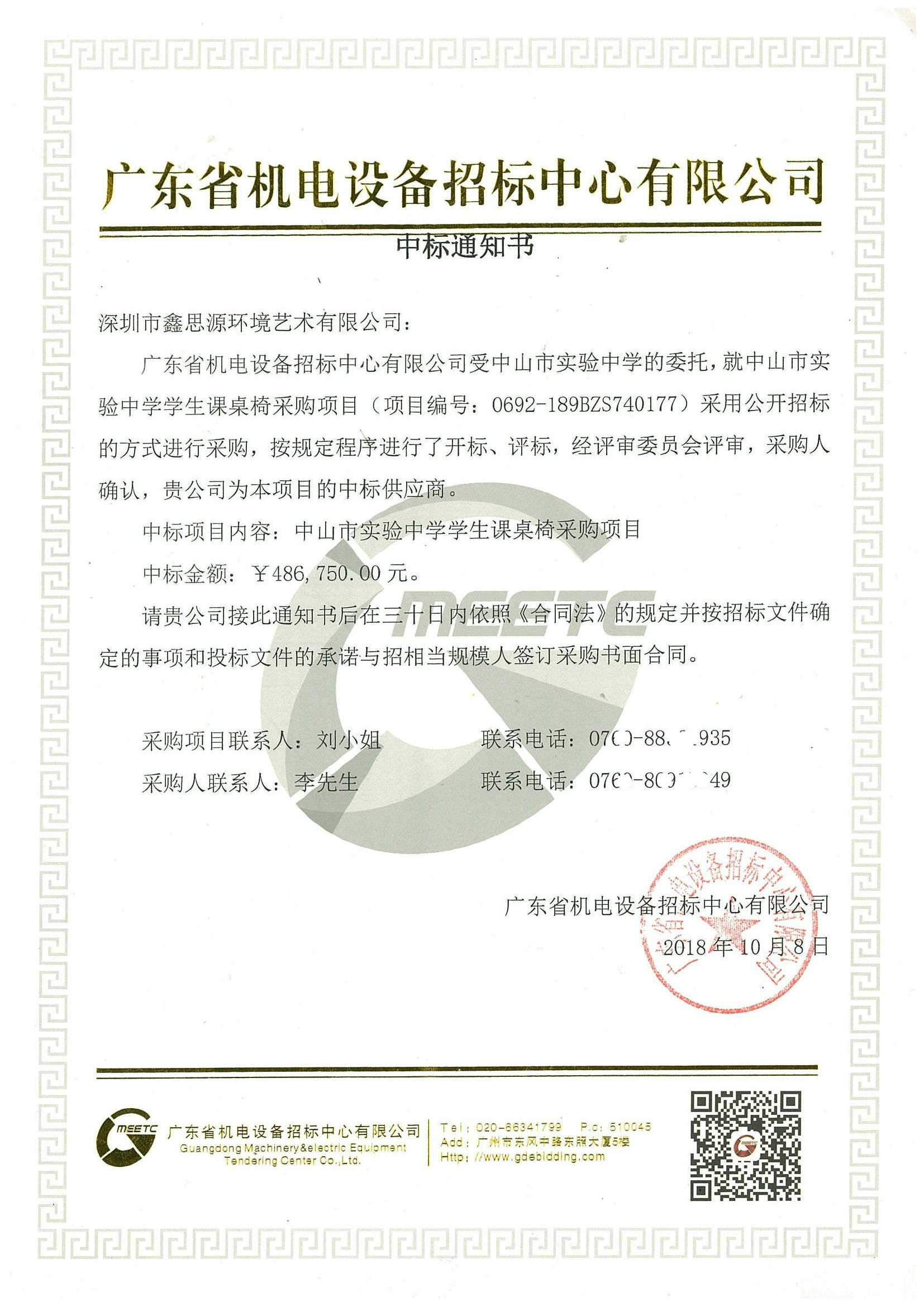 廣東省機電設備招標中心辦公家具采購中標通知書